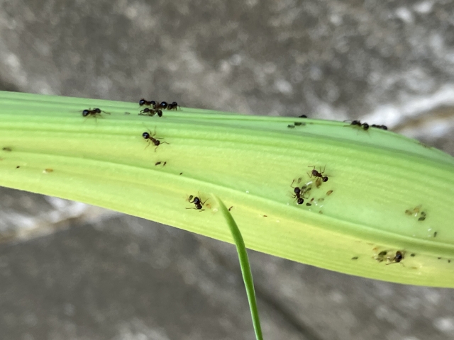 アブラムシは春先、風に乗って飛んできます。メス1匹だけからでもたくさんの子どもを産み、いっぱいになります。葉がベトベトとした感じになり、運び屋のアリが登ったり下がったり、葉が黒くススケたりしてくると、かなり重傷です。