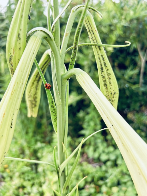 ササユリなど弱いものは、葉に水がついている状態のところで温度が上がると、すぐにボトリチスの病斑が出てきます。病徴の出たものは、殺菌剤をかけても決して元通りに治らないことを頭に入れておいてください。