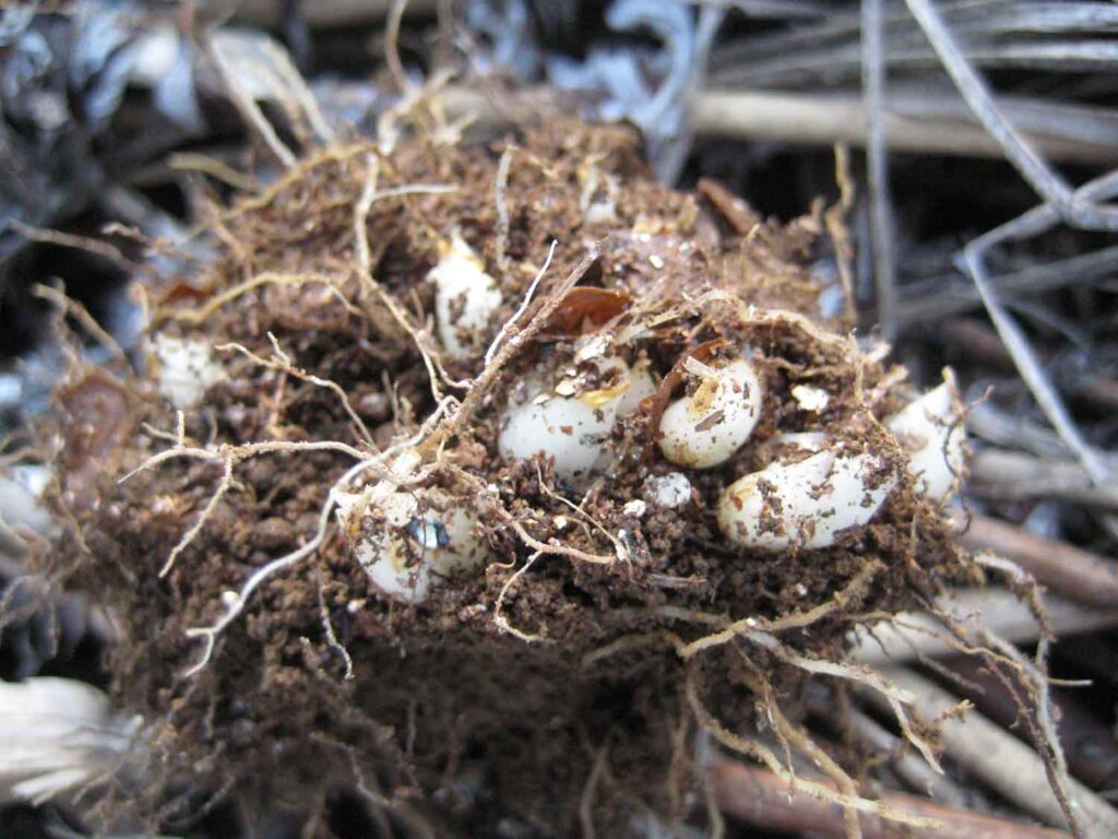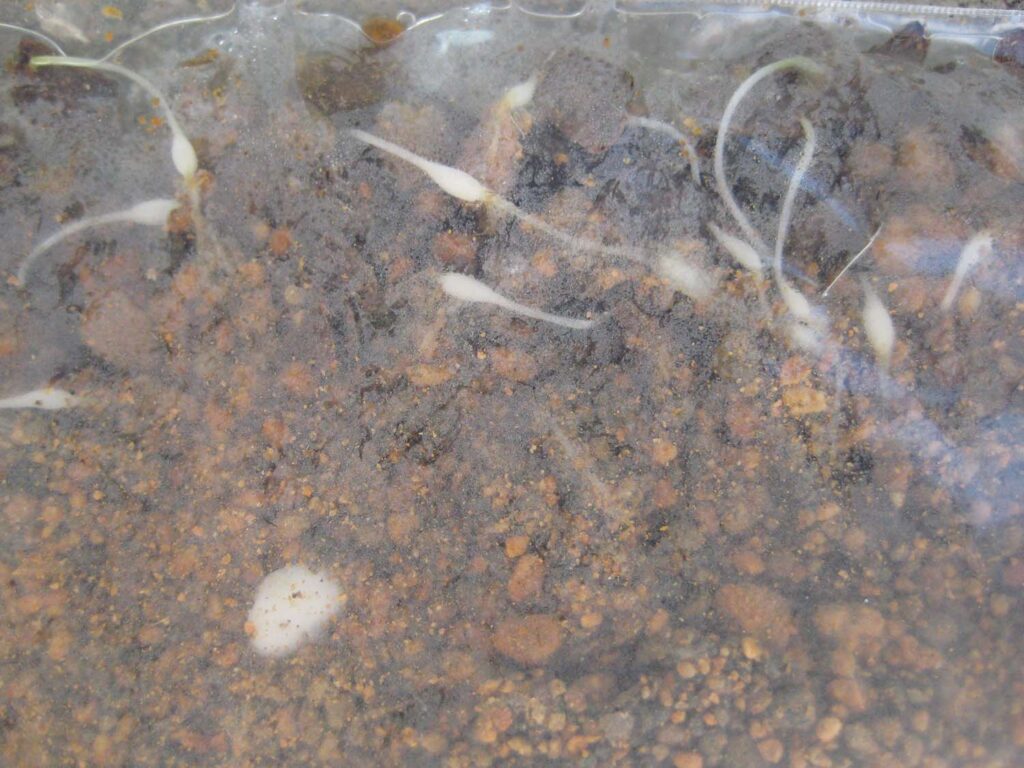 普通に土に種子を蒔くと、1年目は管理が大変なので袋まきにします。バーミキュライトを少し湿らせたものに種子を混ぜ、ビニール袋に入れて約1年間冷暗所に置いておくだけです。ほぼ1年たつと、真っ白の小さな球根ができています。