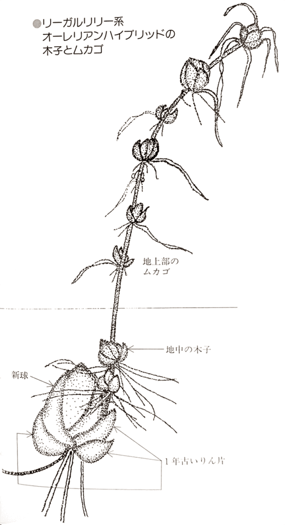地上部の茎の葉の付け根につく鱗片小球を珠芽(しゅが=ムカゴ)といい、地中の茎につくものを木子(きご)といいます。