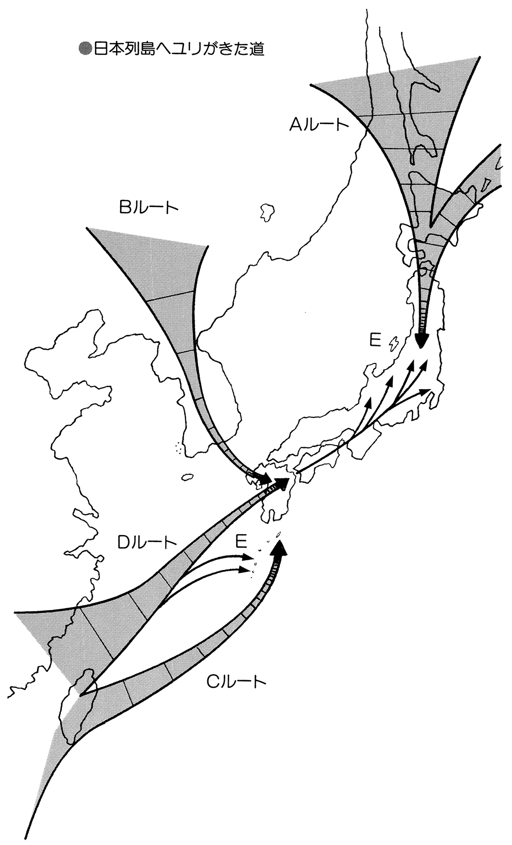 朝鮮半島からのもので、中国東北部→朝鮮半島→対馬から日本に入った流れで、オニユリ、コオニユリ、ヒメユリのルートです。