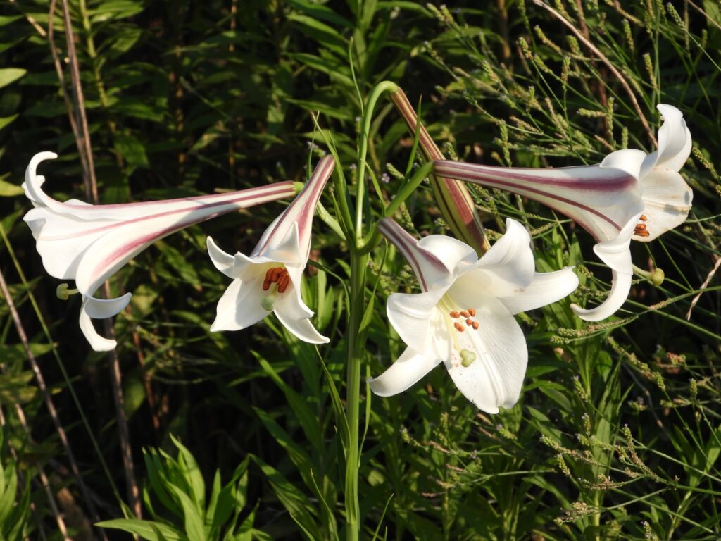 テッポウユリの近縁種で台湾原産。種子でよく増える丈夫な種類で、日本でも野生化しています。